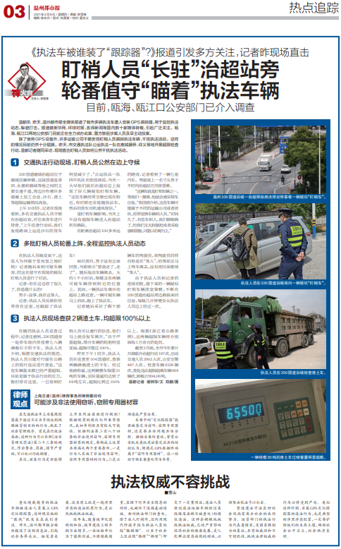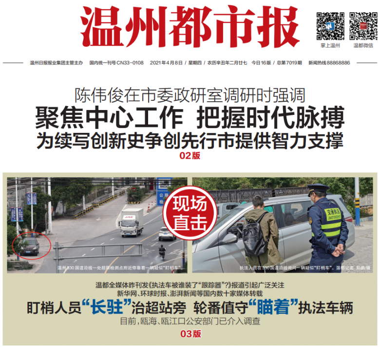 4月7日,温州都市报全媒体报道了我市多辆执法车遭人安装GPS跟踪器,用于监控执法动态,躲避打击。报道被澎湃新闻、新华网、环球时报等国内数十家媒体转载,引起广泛关注。瓯海、瓯江口两地公安部门目前正在全力侦办此案,警方敦促涉案人员及早主动投案。