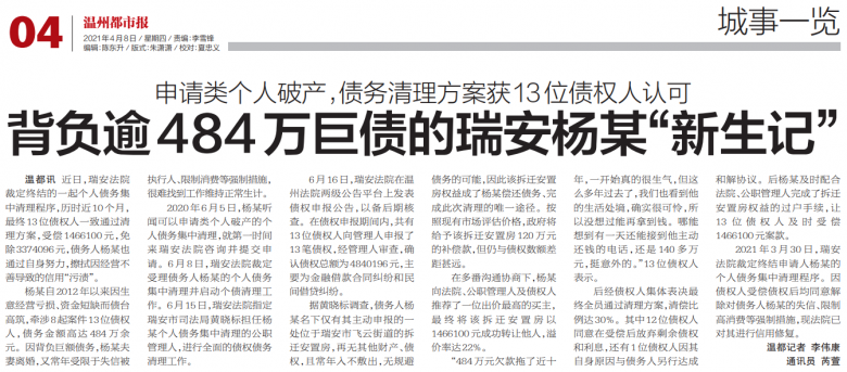 近日,瑞安法院裁定终结的一起个人债务集中清理程序,历时近10个月,最终13位债权人一致通过清理方案,受偿1466100元,免除3374096元,债务人杨某也终通过自身努力,擦拭因经营不善导致的信用“污渍”。