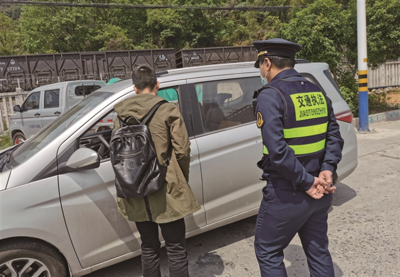执法人员在330国道沿线询问一辆疑似“盯梢车”。