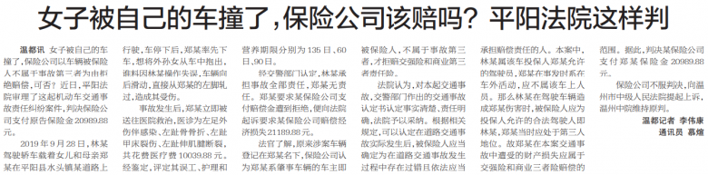 女子被自己的车撞了,保险公司以车辆被保险人不属于事故第三者为由拒绝赔偿,可否?近日,平阳法院审理了这起机动车交通事故责任纠纷案件,判决保险公司支付原告保险金20989.88元。