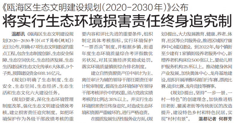 《瓯海区生态文明建设规划(2020-2030年)》(以下简称《规划》)近日公布,明确47项生态文明建设的重点工程,包含生态制度创新、生态安全保障、生态空间优化、生态经济发展、生态生活建设和生态文化传承6大体系、9个子类,预算建设资金688.16亿元。