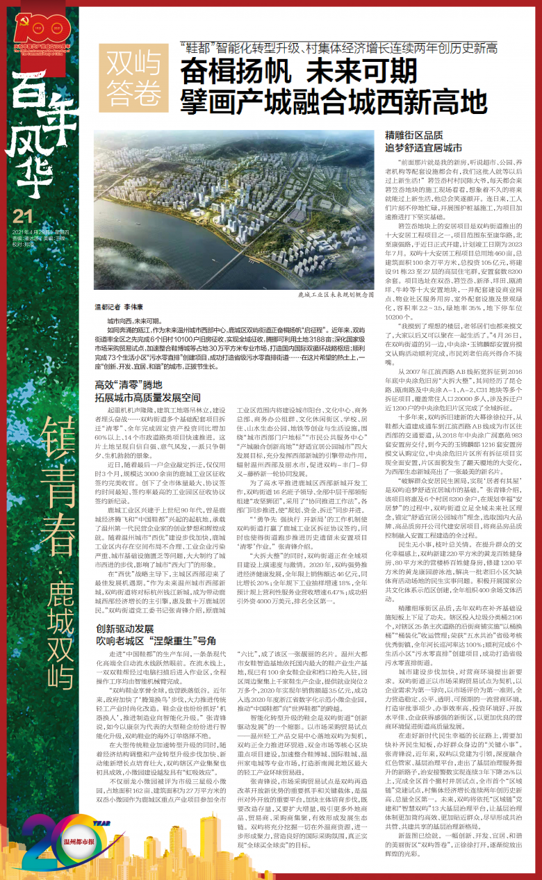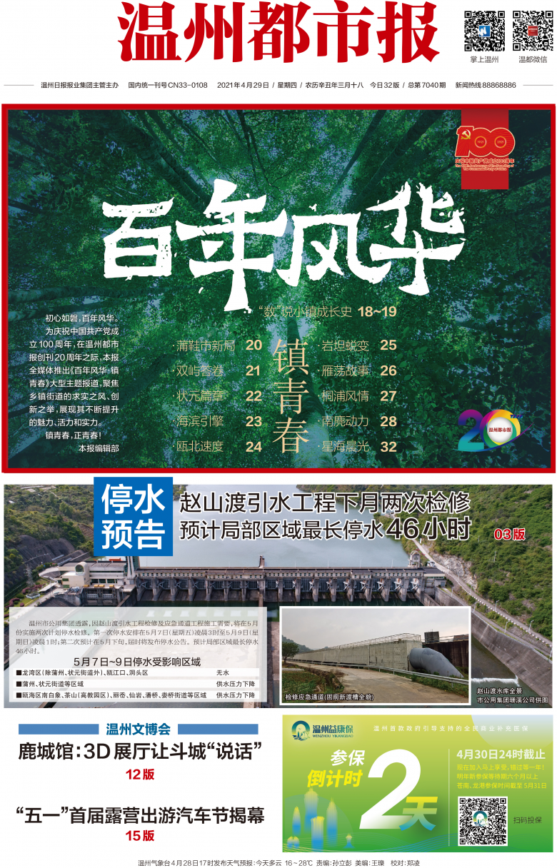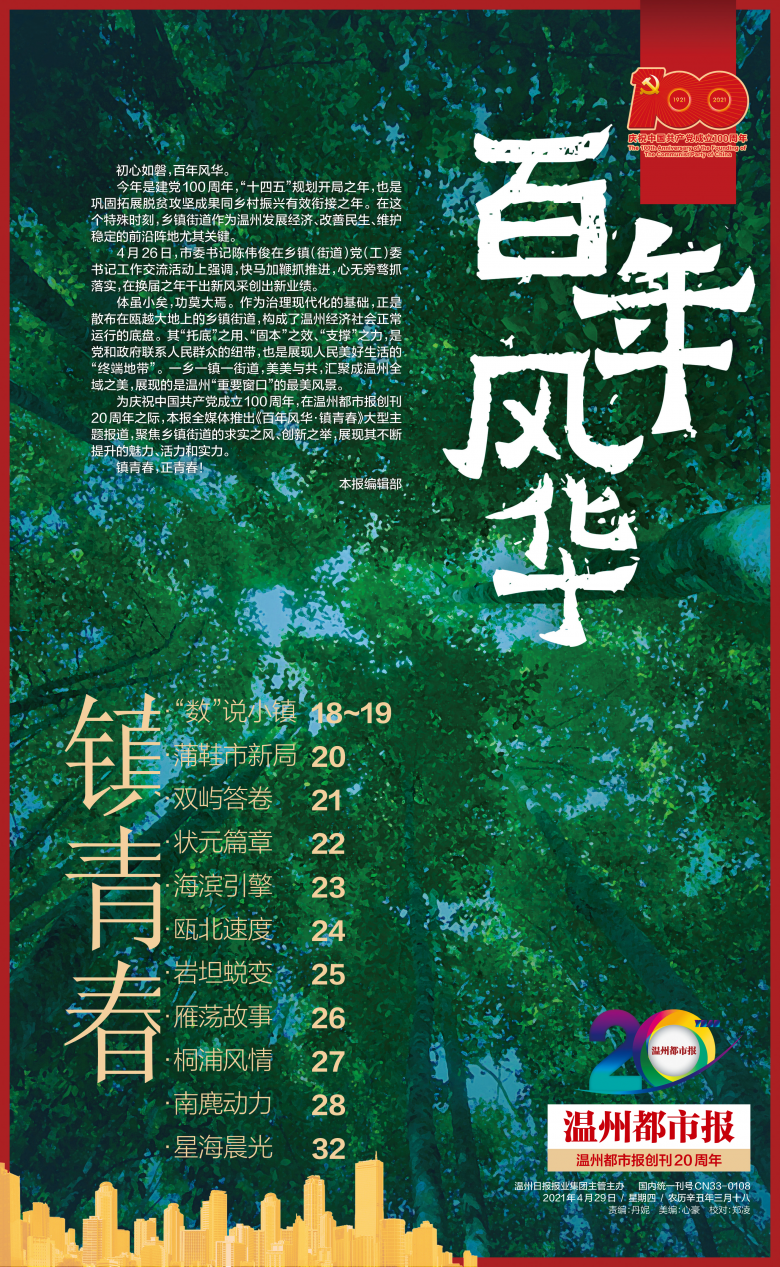 为庆祝中国共产党成立100周年,在温州都市报创刊20周年之际,本报全媒体推出《百年风华·镇青春》大型主题报道,聚焦乡镇街道的求实之风、创新之举,展现其不断提升的魅力、活力和实力。