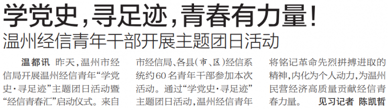 4月29日,温州市经信局开展温州经信青年“学党史·寻足迹”主题团日活动暨“经信青春汇”启动仪式。来自市经信局、各县(市、区)经信系统约60名青年干部参加本次活动。通过“学党史·寻足迹”主题团日活动,温州经信青年将铭记革命先烈拼搏进取的精神,内化为个人动力,为温州民营经济高质量贡献经信青春力量。