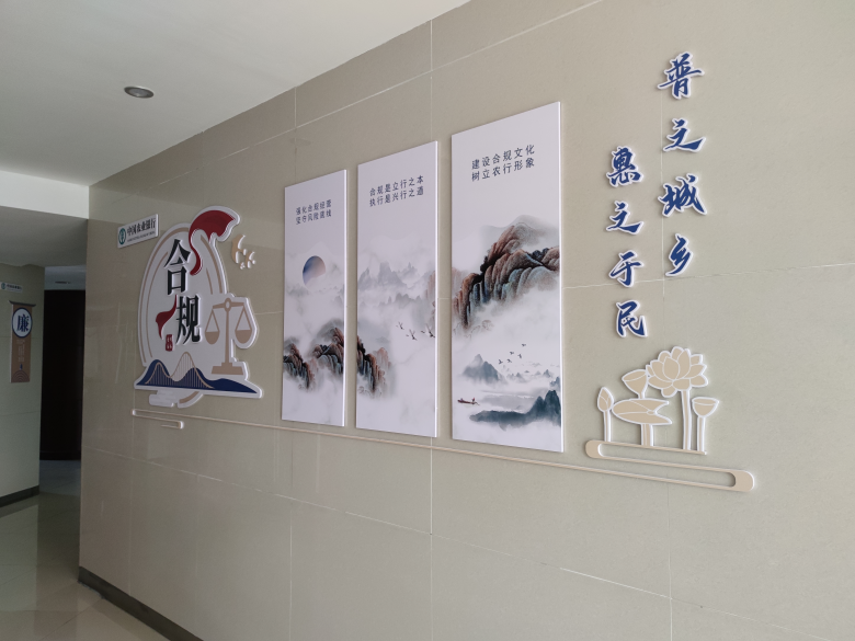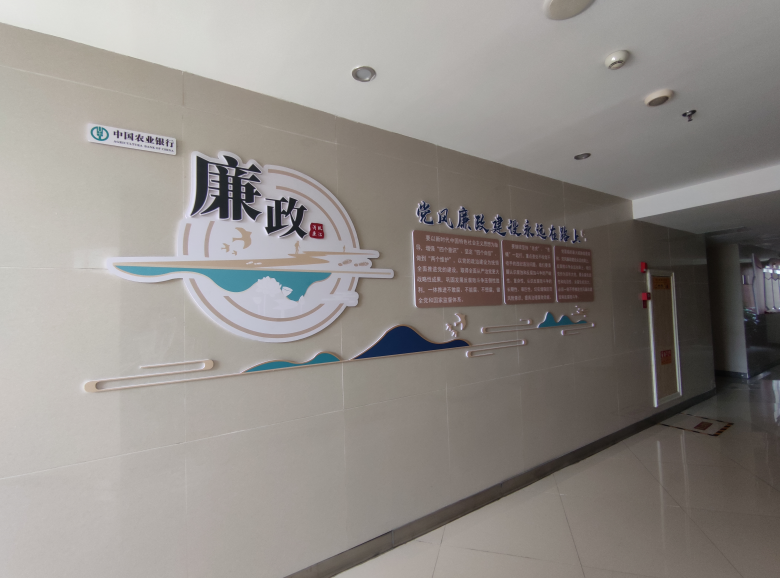 在廉政合规走廊的建设中,该行按照“廉政教育走廊,营造合规文化氛围,延伸廉政建设触角”的工作思路,注重以创新方式拓展教育内容。廉政合规走廊由四面墙组成,包括“廉政”、“合规”、“家风”、“廉洁奉公”。一是党风廉政建设永远在路上。“廉政”墙聚焦十九届中央纪委第三次、四次、五次全会精神,与新形势下的党风廉政建设的目标要求相适应,既是员工身边的风景线,也是干部作风的警示钟,更是群众利益的监督岗。二是强化合规经营坚守风险底线。“合规”墙以“普之城乡 惠之于民”为主题,节选合规经营话语,平衡业务经营发展和风险控制。三是提高清廉家风的意识传达。“家风”墙展示了员工家风家训,引导全行上下员工严格管好家属子女,严格家教家风,充分发挥廉洁文化的教育熏陶作用。四是廉洁奉公一心为民。“廉洁奉公”墙通过解释廉、洁、奉、公四个字的含义,警示农行员工要做一个品行正直、尊法守纪、大公无私的人。