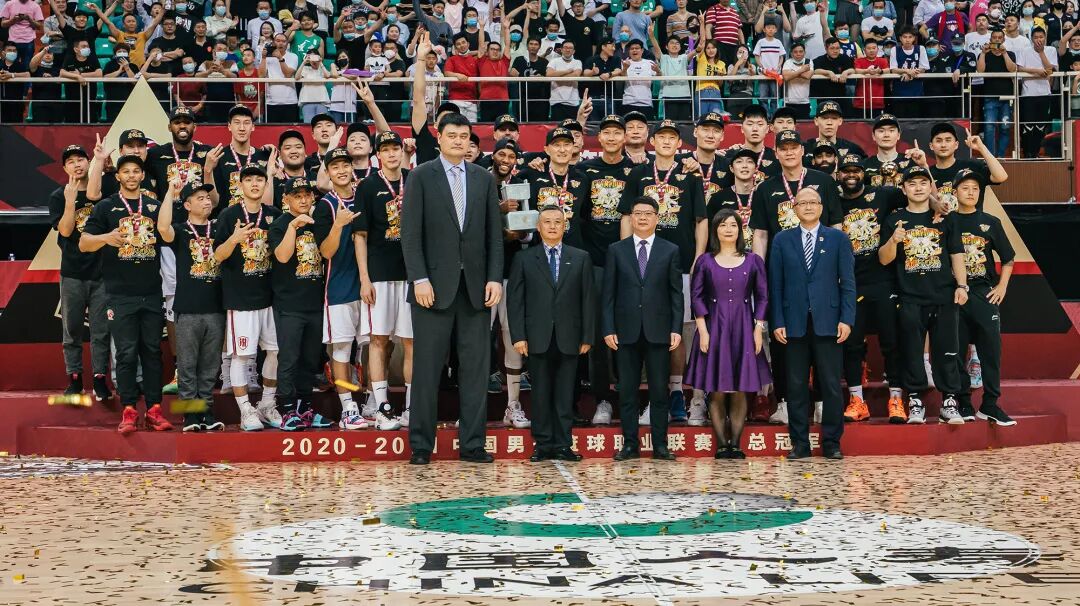 全国保险系统劳动模范、中国保险年度人物,中国人寿寿险公司第一团队“银海团队”创始人李江红与CBA联盟首席执行官张雄共同为球员胡明轩颁发MVP奖杯,并在颁奖仪式后与冠军队伍合影。