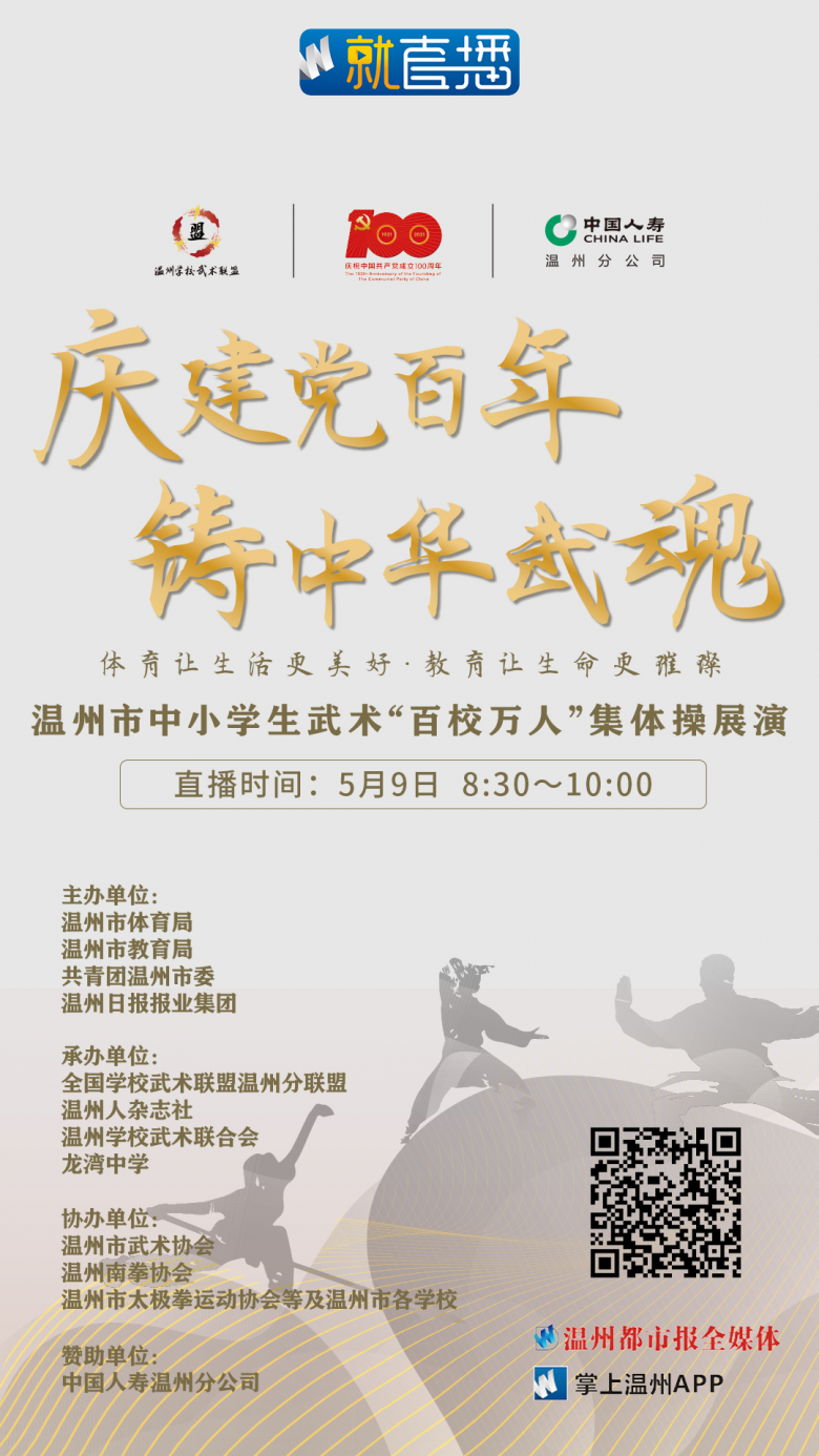 温都讯 记者昨天获悉,我国10位武术世锦赛冠军近日录制视频,预祝5月9日在温州举办的“庆建党百年•铸中华武魂”百校万人中华武术大展演活动圆满成功。