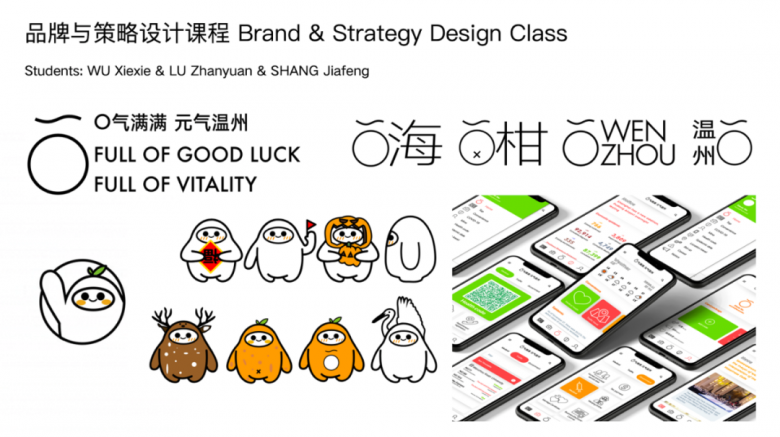 在各样的作品中,有同学们用汉字笔画拼出温州英文字母,结合随形印章,创造出了体现人文山水特色的温州城市标识,并应用在了App和非遗博物馆网站的设计中;有同学将温州的简称“瓯”结合英文字母“O”,瓯柑圆润的形状中得到灵感,并创造了憨态可掬的O柑、O鹿、O鹭的吉祥物形象。伴随一款“掌上温州”的App,就像标语“O气满满 元气温州”一样,年轻且有个性;还有采用了 “温州真生活”这一宣传标语 (在方言里具有”真了不起”的意思) 以传达温州的真实生活。他们将矢量图案结合无衬线字体,形成年轻活跃的风格。比如,龙湾区是一架飞机(代表着温州龙湾机场),鹿城是一头正在大步跨越的鹿……