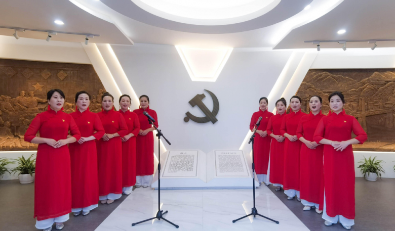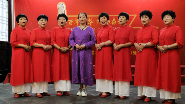 在仙岩街道渔潭村,来自造诣艺术团的10名成员以中共浙南一大会址为背景,自发组织齐唱《唱支山歌给党听》,悠扬的唱腔回荡在潺潺溪水、层层山峦间,唱响浓浓爱国情。