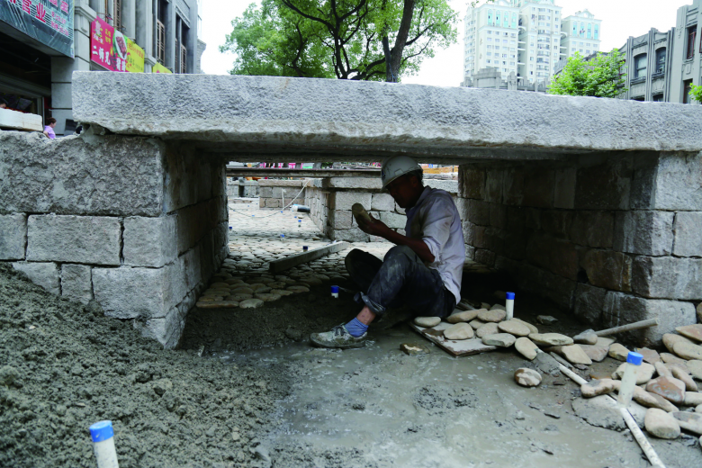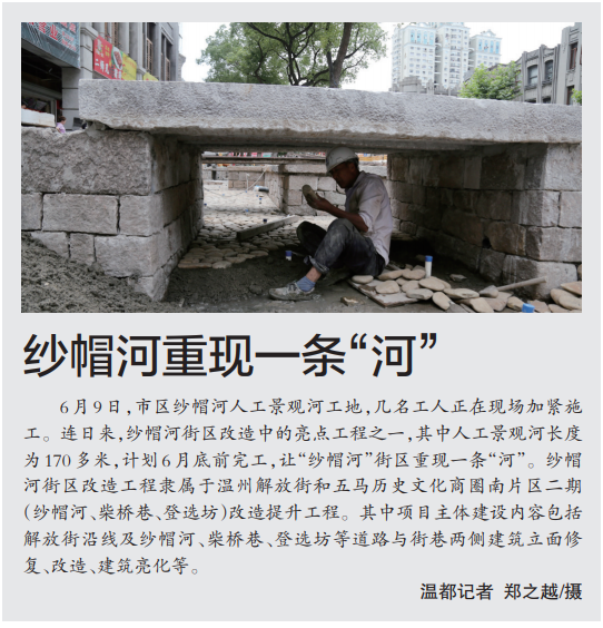 6月9日,市区纱帽河人工景观河工地,几名工人正在现场加紧施工。连日来,纱帽河街区改造中的亮点工程之一,其中人工景观河长度为170多米,计划6月底前完工,让“纱帽河”街区重现一条“河”。纱帽河街区改造工程隶属于温州解放街和五马历史文化商圈南片区二期(纱帽河、柴桥巷、登选坊)改造提升工程。其中项目主体建设内容包括解放街沿线及纱帽河、柴桥巷、登选坊等道路与街巷两侧建筑立面修复、改造、建筑亮化等。