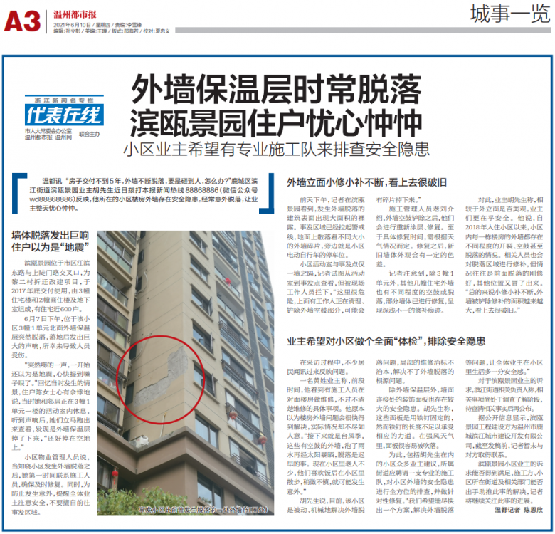 6月7日下午,位于该小区3幢1单元北面外墙保温层突然脱落,落地后发出巨大的声响,所幸未导致人员受伤。