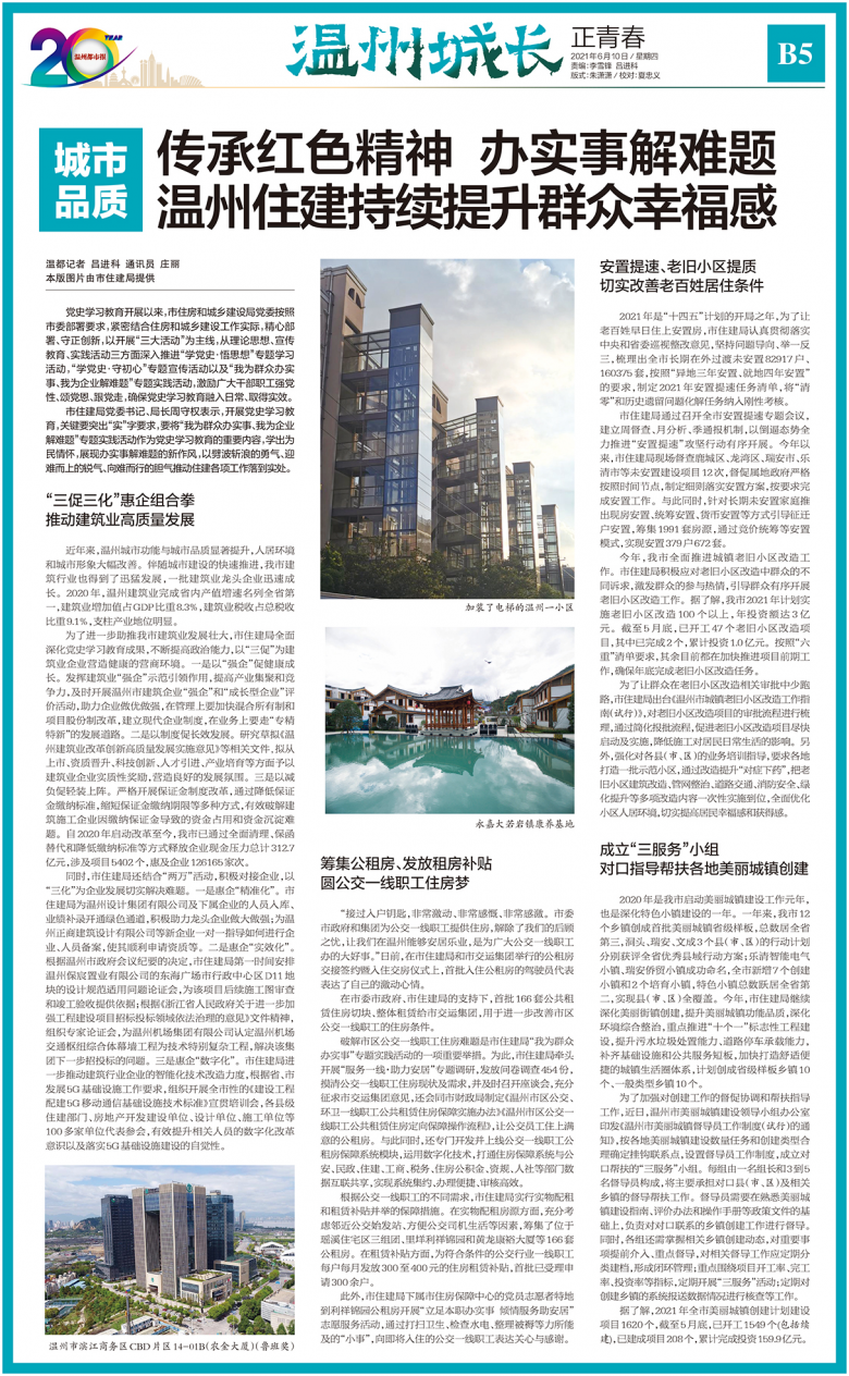 为了让群众在老旧小区改造相关审批中少跑路,市住建局出台《温州市城镇老旧小区改造工作指南(试行)》,对老旧小区改造项目的审批流程进行梳理,通过简化报批流程,促进老旧小区改造项目尽快启动及实施,降低施工对居民日常生活的影响。另外,强化对各县(市、区)的业务培训指导,要求各地打造一批示范小区,通过改造提升“对症下药”,把老旧小区建筑改造、管网整治、道路交通、消防安全、绿化提升等多项改造内容一次性实施到位,全面优化小区人居环境,切实提高居民幸福感和获得感。
