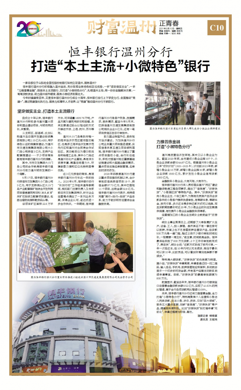 自成立十年以来,恒丰银行温州分行积极参与温州重大项目和国企建设项目,与城市同成长,共繁荣。