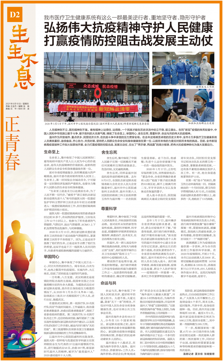以温州市中心医院院感科科长陈身贤、温医大附一院呼吸与危重症医学科副主任医师欧阳金生为代表的37位温州援鄂医疗队员,逆行驰援武汉58天、治愈387例,彰显新时代温州人的精神,被评为“最美温州人”2020感动温州十大人物。