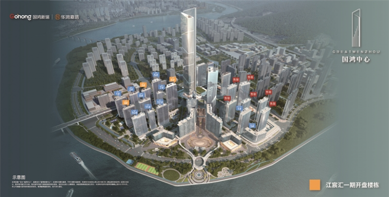 国鸿中心立于三江商务区核芯,占位一线瓯江,与鹿城广场隔江相望,以约150亿超大手笔和造城模式,集聚摩天大楼、高端商业、旗舰办公、五星酒店、江景华宅、滨江金融商务等超级要素,打造一座约130万方体量、制高点约350米的超级大盘,打造综合体界“超级新物种”。