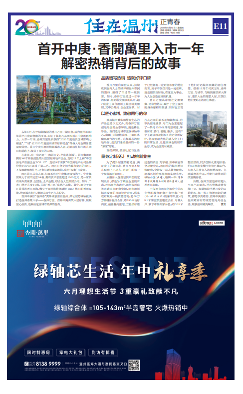去年6月,位于绿轴板块的香开万里一期开盘,成为温州2020年首个开盘即售罄的项目,印证了其超凡品质和首开中庚的影响力。入市一年内,香开万里先后获得“2020年度最具区域影响力楼盘”、“‘城’长2020年度温州城市标杆红盘”等各大专业媒体重量级荣誉。首开中庚在温州精筑城市人居、进阶居住标杆的共同目标道路上,收获了良好的口碑。
