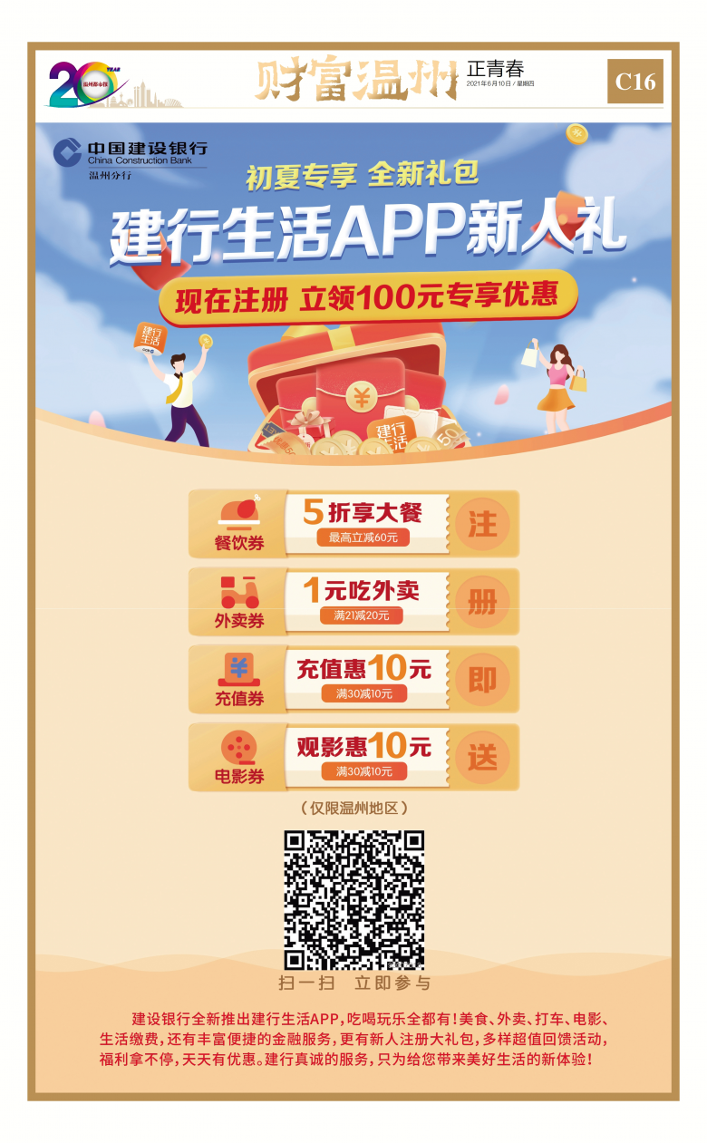 财富温州·正青春 | 建设银行温州分行:生活APP新人礼,现在注册立领100元专享优惠