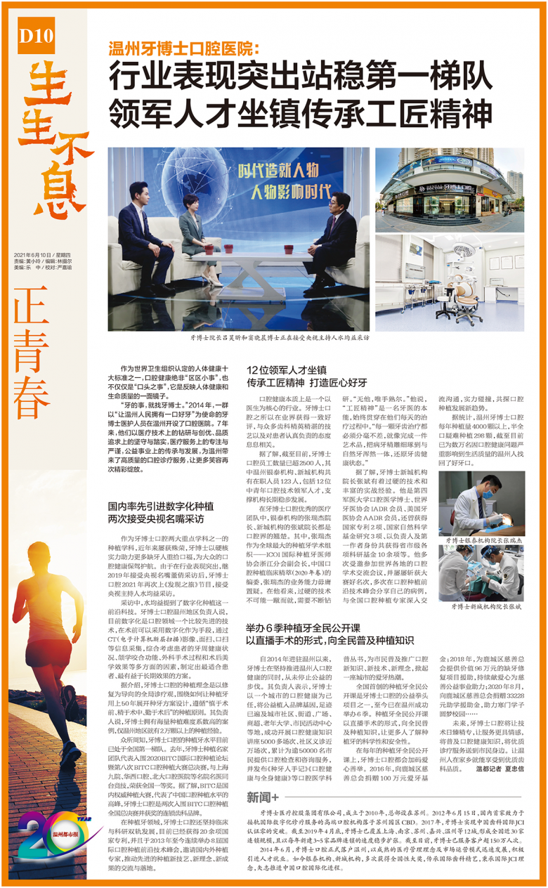 “牙的事,就找牙博士。”2014年,一群以“让温州人民拥有一口好牙”为使命的牙博士医护人员在温州开设了口腔医院。7年来,他们以医疗技术上的钻研与创优、品质追求上的坚守与踏实,医疗服务上的专注与严谨,公益事业上的传承与发展,为温州带来了高质量的口腔诊疗服务,让更多笑容再次精彩绽放。
