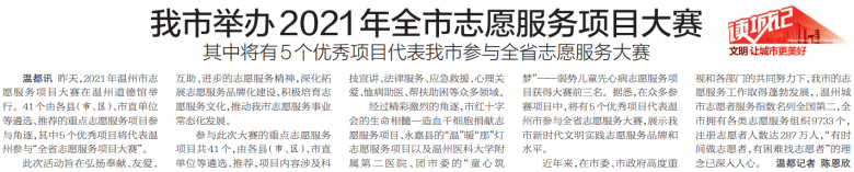 温都讯 6月10日,2021年温州市志愿服务项目大赛在温州道德馆举行。41个由各县(市、区)、市直单位等遴选、推荐的重点志愿服务项目参与角逐,其中5个优秀项目将代表温州参与“全省志愿服务项目大赛”。