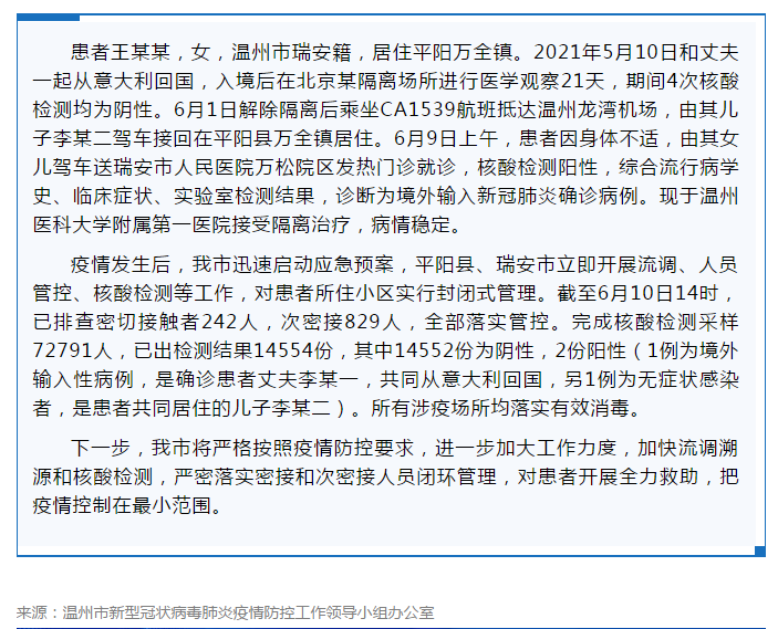 患者王某某,女,温州市瑞安籍,居住平阳万全镇。2021年5月10日和丈夫一起从意大利回国,入境后在北京某隔离场所进行医学观察21天,期间4次核酸检测均为阴性。6月1日解除隔离后乘坐CA1539航班抵达温州龙湾机场,由其儿子李某二驾车接回在平阳县万全镇居住。6月9日上午,患者因身体不适,由其女儿驾车送瑞安市人民医院万松院区发热门诊就诊,核酸检测阳性,综合流行病学史、临床症状、实验室检测结果,诊断为境外输入新冠肺炎确诊病例。现于温州医科大学附属第一医院接受隔离治疗,病情稳定。
