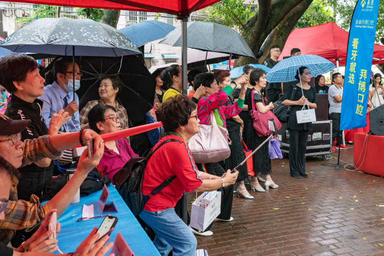 水心桂柑社区选送的节目葫芦丝齐奏《映山红随想》悦耳动听,演员们多才多艺,不仅葫芦丝吹得好,跳起舞来也是婀娜多姿;黄梅戏《夫妻观灯》被荣新艺术团的两位实力唱将演绎得特别到位,深受台下老人的喜爱,虽然下着雨,观众仍然舍不得离场,撑着雨伞跟着哼起了曲调。