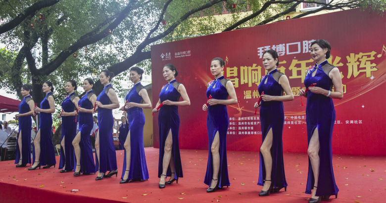 时装走秀《我的祖国》,20位“模特”身着宝蓝色旗袍,走“猫步”姿态优雅,秀出时尚健康的活力,惊艳全场,从海选节目中脱颖而出,获得全场最高分。领队朱瑶琴介绍,她们的年龄五六十岁,身高均在1.7米以上,经常在模特表演活动中获佳绩。