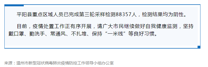平阳县重点区域人员已完成第三轮采样检测88357人,检测结果均为阴性。