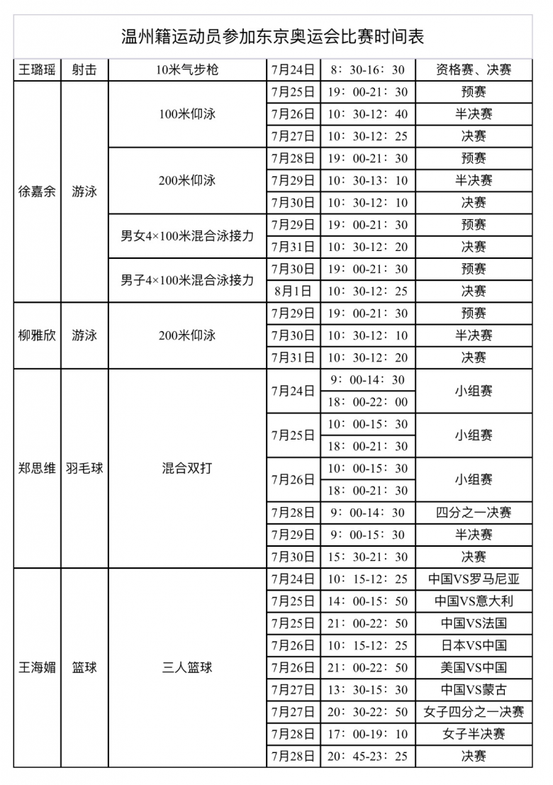 温都讯 东京奥运会将于7月23日晚开幕。温州健儿徐嘉余(游泳)、柳雅欣(游泳)、郑思维(羽毛球)、王璐瑶(射击)、王海媚(三人篮球)5位选手进入中国队参赛名单。记者今天从温州市体育局获悉,他们的比赛时间已正式确定。