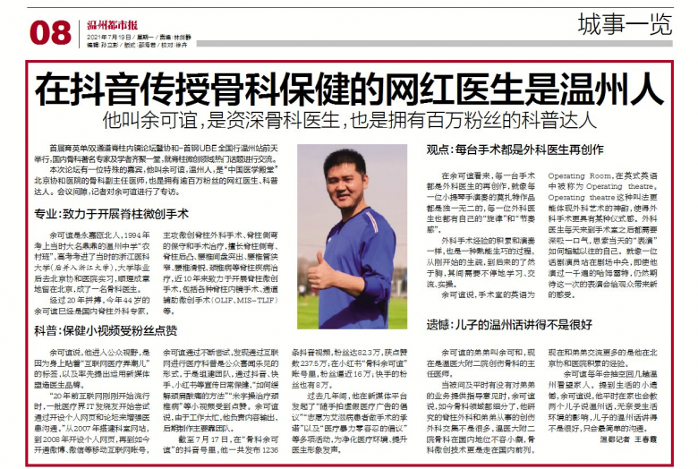 本次论坛有一位特殊的嘉宾,他叫余可谊,是中国最高医学殿堂——北京协和医院的骨科副主任医师和教授,是我们土生土长的温州人。在会议间隙,记者对余可谊教授进行了专访。