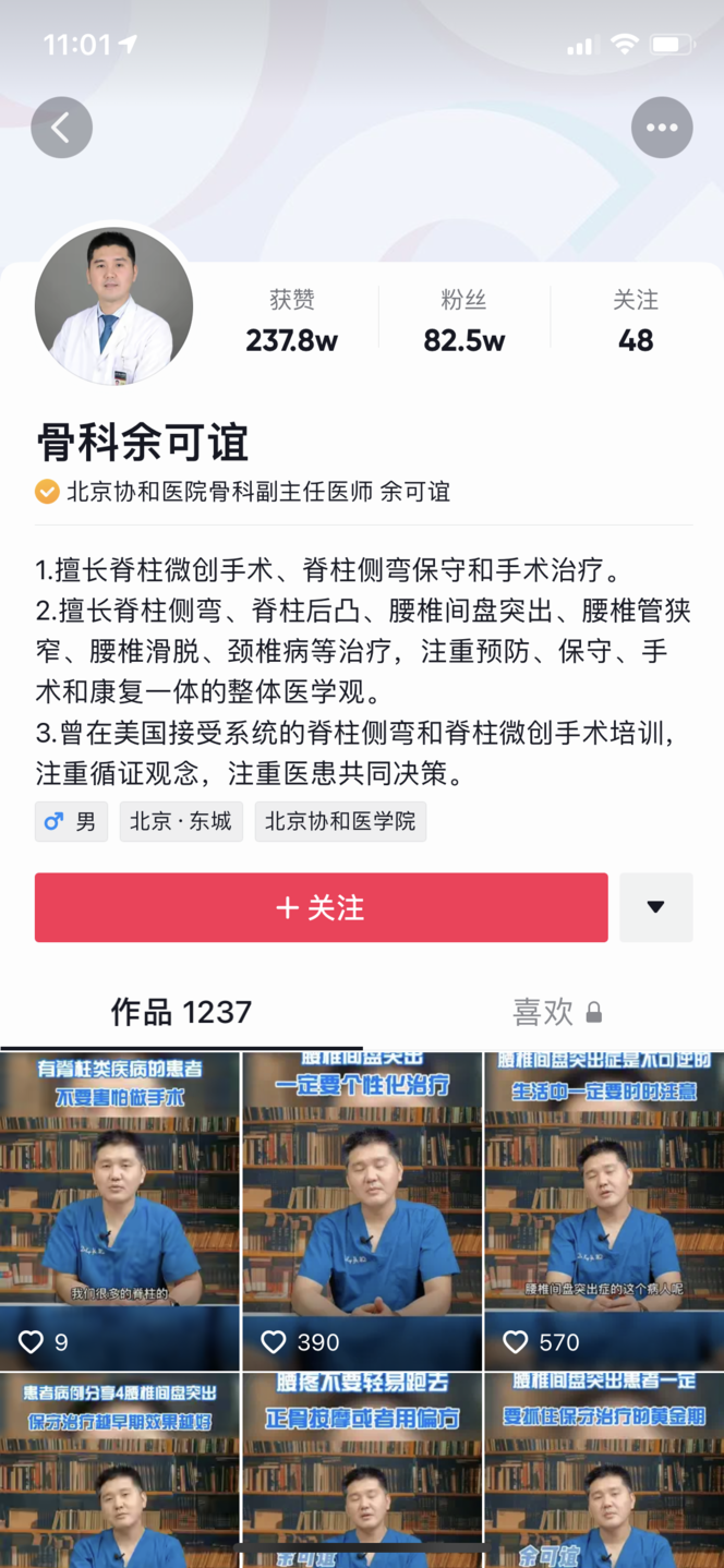 现在在“骨科余可谊”的抖音号里,截至7月17日,他一共发布了1236条抖音视频,粉丝量已经达到82.3万,获点赞数达237.5万;在小红书“骨科余可谊”账号里,粉丝量也逼近16万。