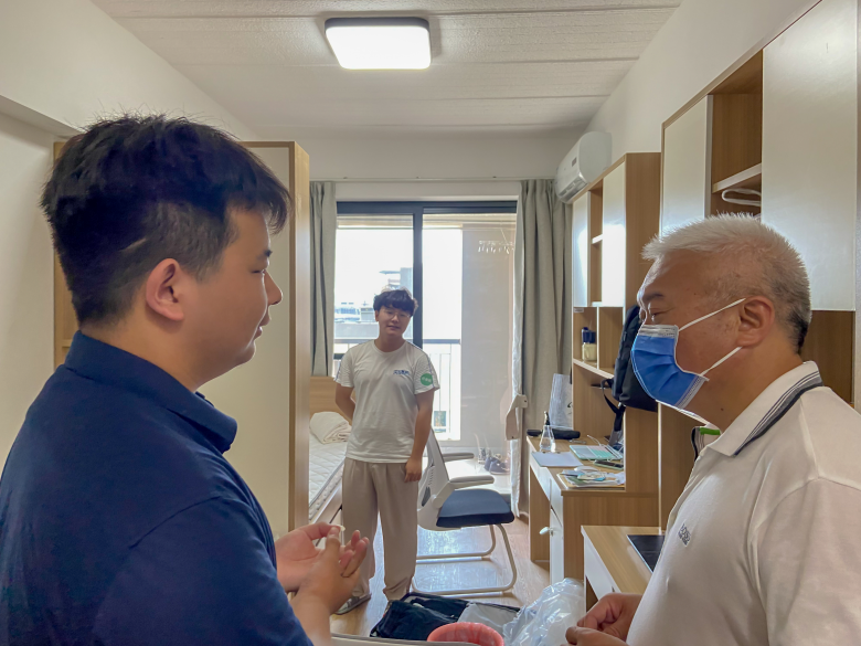 报到第一天,来自四川的大一新生李睿朗和何坤泽,就在寝室迎来的第一个客人——学校党委书记王北铰。“寝室都还喜欢吗?”王北铰书记亲切地询问了他们是否适应校园生活,当得知两人都来自成都时,更鼓励他们大学时要珍惜同窗情谊,共同进步。王北铰书记还在校门口查看了学生的入校接待、疫情防疫情况,并详细询问了寝室楼、食堂等后勤保障工作。