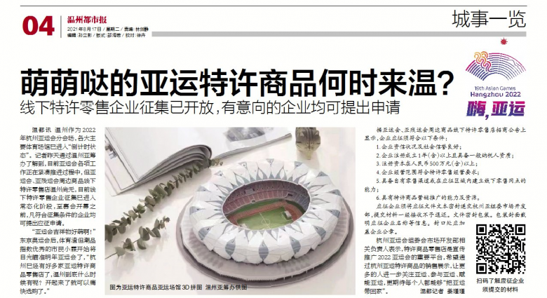 温都讯 温州作为2022年杭州亚运会分会场,各大主要体育场馆已进入“倒计时状态”。记者今天通过温州亚筹办了解到,目前亚运会各项工作正在紧凑推进过程中,但亚运会、亚残运会周边商品线下特许零售店温州尚无,目前线下特许零售企业征集已进入常态化阶段,至赛会开幕之前,凡符合征集条件的企业均可提出应征申请。