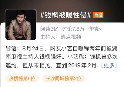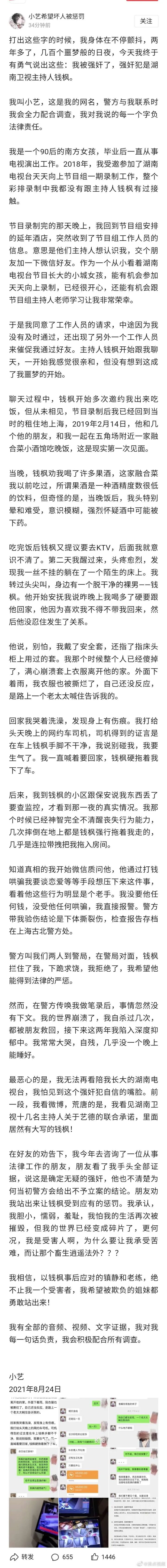 8月24日下午,网友小艺在网上发长文控诉被湖南卫视主持人钱枫强奸,并在最后表示:我有全部的音频、视频、文字证据,我对我每一句话负责,我会积极配合所有调查。