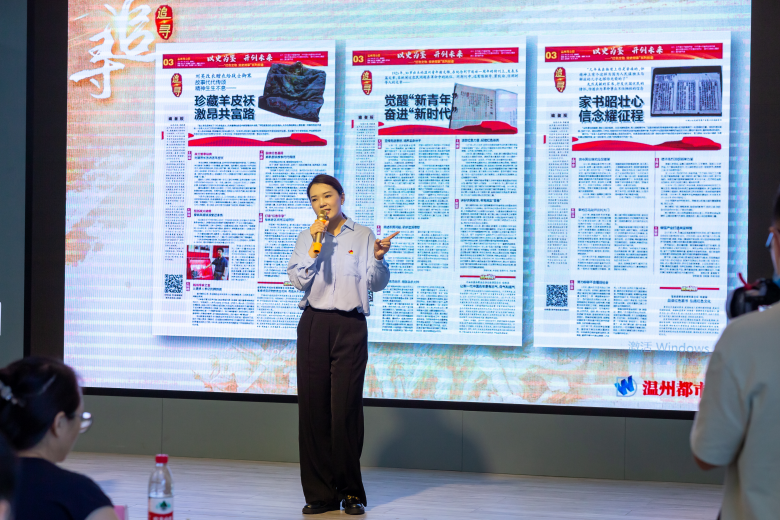 温州都市报记者林晨颖向在座听众展示了三件文物——一份洞头女民兵当年写下的发黄的血书;一件刘英赠给站岗战士御寒的羊皮袄;一本1925年出版的《新青年》刊发了温州青年谢文锦的文章《列宁与农民》。她讲述的是都市报年轻记者们寻访红色文物、传承红色基因的故事。今年7月,温州都市报启动了“红色文物 党史故事”系列报道活动,寻访那些在血与火的洗礼中留存下来的物件,让红色文物蕴含的精神被更多人知晓、传诵。这次寻访活动已被中央党史和文献研究院列为专项宣传引导项目,浙江三个项目入选,温州仅此一个。在林晨颖的讲述中,再现了温州都市报记者深入老区、远赴海岛,寻找散落在温州各地的红色文物,访问历史事件的知情人,追寻先辈初心等一幕幕。“如果说,时间是一条单行道,那红色文物就是百年历史长河中最清晰的路标,它告诉我们,怎样从昨天走到了今天,未来应该怎么走。”林晨颖这样说道。