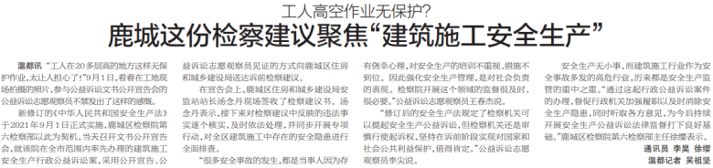 新修订的《中华人民共和国安全生产法》于2021年9月1日正式实施,鹿城区检察院第六检察部以此为契机,当天召开文书公开宣告会,就该院在全市范围内率先办理的建筑施工安全生产行政公益诉讼案,采用公开宣告、公益诉讼志愿观察员见证的方式向鹿城区住房和城乡建设局送达诉前检察建议。