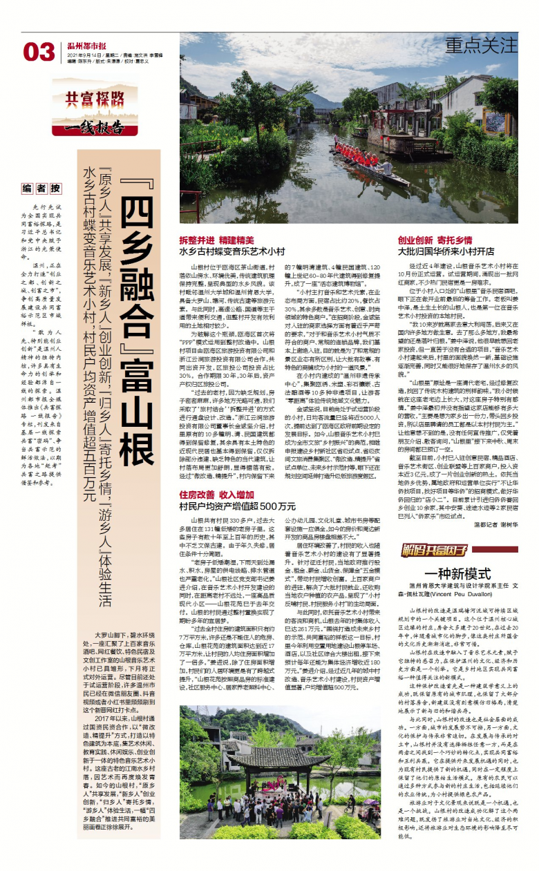 山根村在改造中融入了音乐艺术元素,赋予它独特的感召力,在保护温州的文化、经济和历史方面是一个创举。它是乡村地区实现共同富裕一种值得关注的新模式。