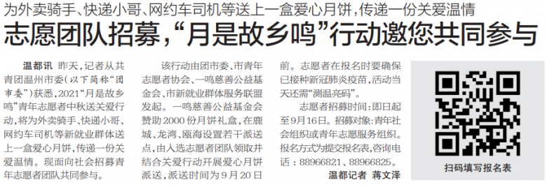 9月14日,记者从共青团温州市委(以下简称“团市委”)获悉,2021“月是故乡鸣”青年志愿者中秋送关爱行动,将为外卖骑手、快递小哥、网约车司机等新就业群体送上一盒爱心月饼,传递一份关爱温情。现面向社会招募青年志愿者团队共同参与。