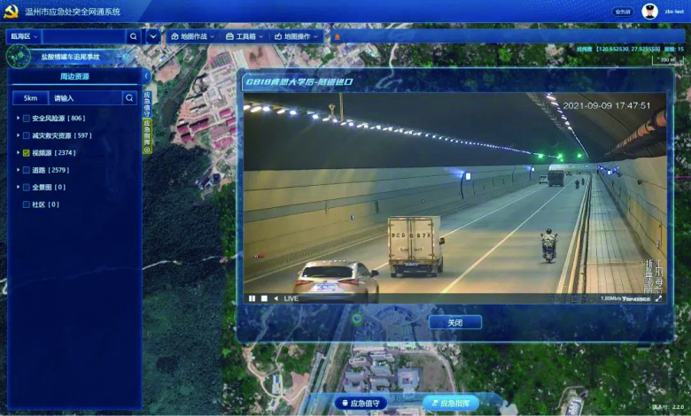 “过去公路隧道发生危化品泄漏时,指挥人员赶到现场时,往往已经是浓烟滚滚,不清楚是什么危化品泄漏,被困人员的数量等情况,只能根据以往的经验以及事故现场的地形进行救援力量的调度。这样会导致救援力量无法高效地开展救援。”温州市应急管理局科技规划处处长郑益群介绍,智慧应急“一张图”可以进行视频对接报警人员,了解泄漏什么危化品,现场人员伤亡情况,并观察报警人员的周边情况,提供最佳的救援方案。