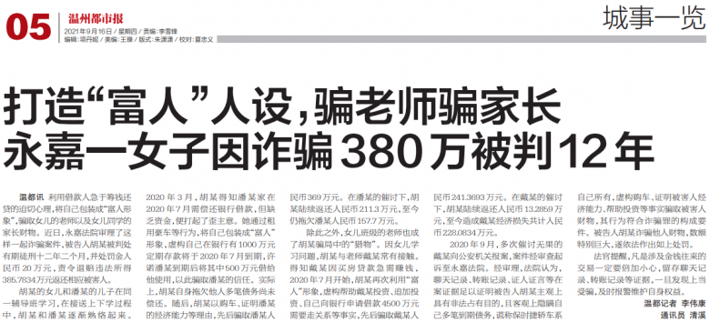 利用借款人急于筹钱还贷的迫切心理,将自己包装成“富人形象”,骗取女儿的老师以及女儿同学的家长财物。近日,永嘉法院审理了这样一起诈骗案件,被告人胡某被判处有期徒刑十二年二个月,并处罚金人民币20万元,责令退赔违法所得385.7834万元返还相应被害人。