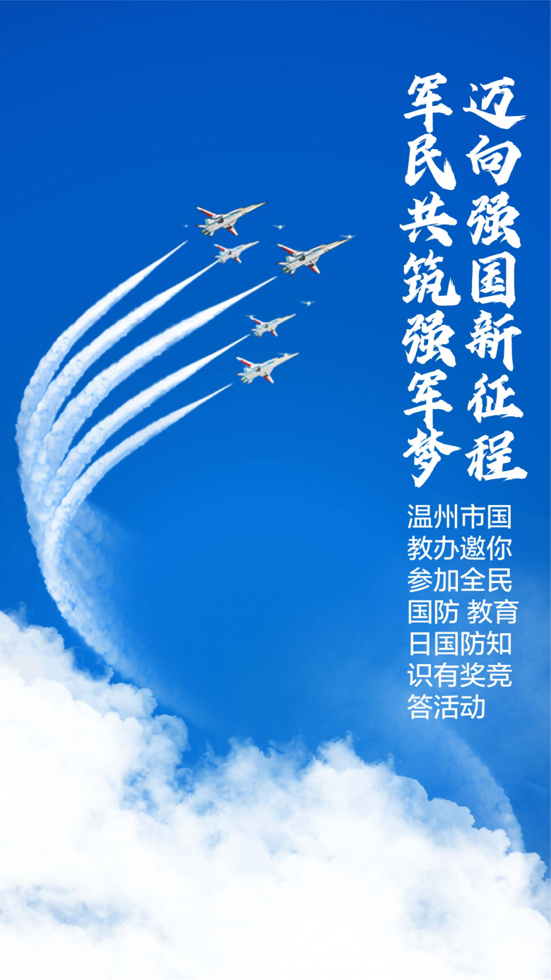 今年9月18日是我国第二十一个全民国防教育日,教育日所在周为浙江省第10个国防教育周。为切实增强全民国防观念,深入推进我市国防教育工作,进一步营造全市关心国防、支持国防、参与国防、建设国防的浓厚气氛。温州市国防教育办公室联合温州都市报开展主题为“迈向强国新征程·军民共筑强军梦”全民国防教育日国防知识有奖竞答活动。