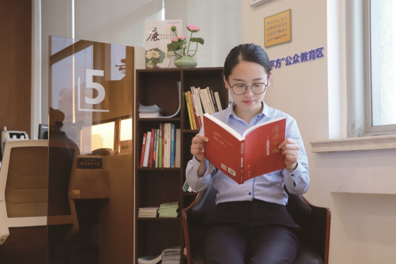 图为人保财险温州市分公司员工利用业余时间,在“清廉书吧”充电学习,畅谈清廉文化。陈斌/摄