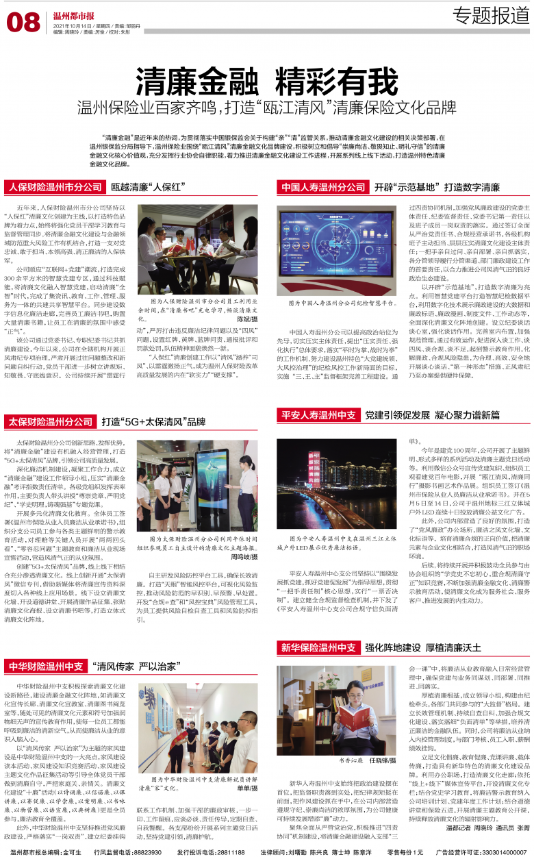 太保财险温州分公司创新思路、发挥优势,将“清廉金融”建设有机融入经营管理,打造“5G+太保清风”品牌,引领公司高质量发展。