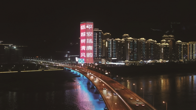 图为平安人寿温州中支在温州三江立体城户外LED展示优秀廉洁标语。