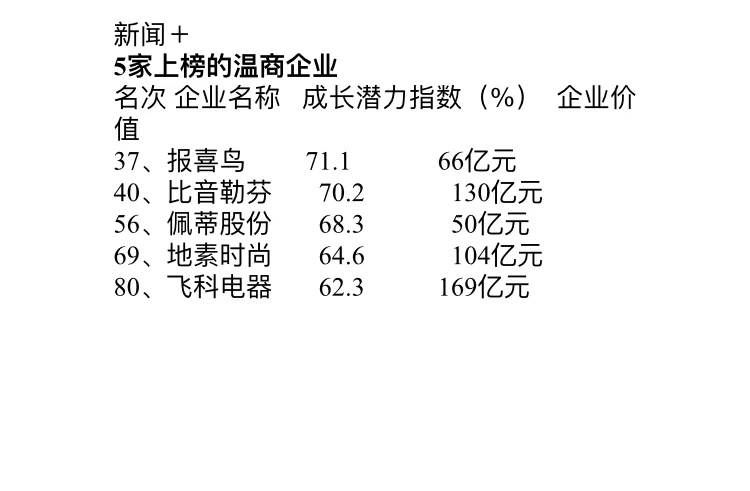 从榜单看,BOSS直聘、科沃斯和泡泡玛特这三家企业位列前三;入围的5家温商企业,报喜鸟名次最靠前,为第37名,最靠后的为飞科电器,列第80名。同时,入围的5家温商企业有3家来自纺织服装行业,分别是报喜鸟、比音勒芬、地素时尚。