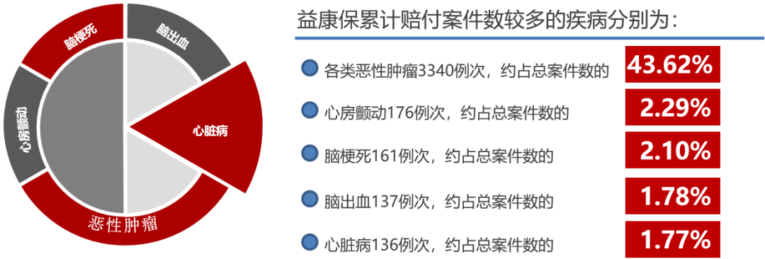 从赔付案例的疾病分布来看,占比最高的是恶性肿瘤,约占总案件数的43.62%;其次是心房颤动、脑梗死、脑出血和心脏病。