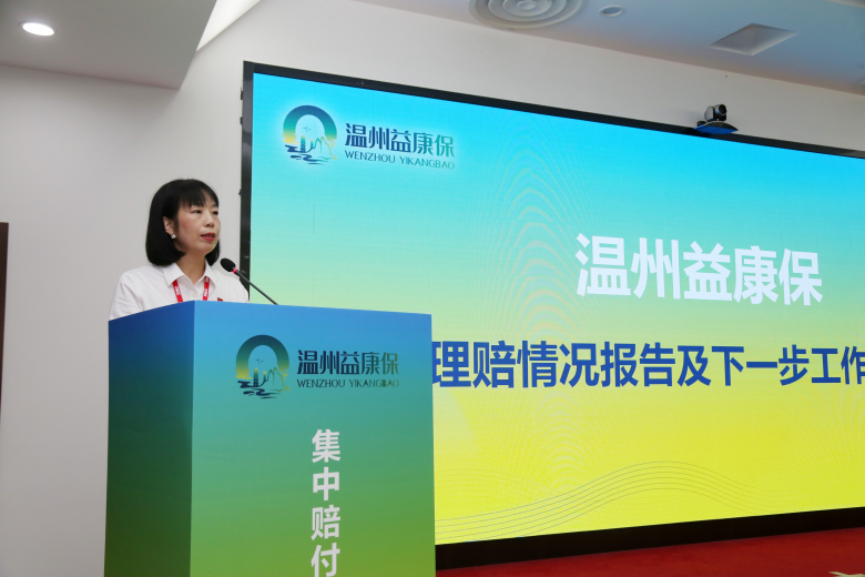 图为益康保主承保公司代表吴海珍汇报理赔情况及下一步工作安排