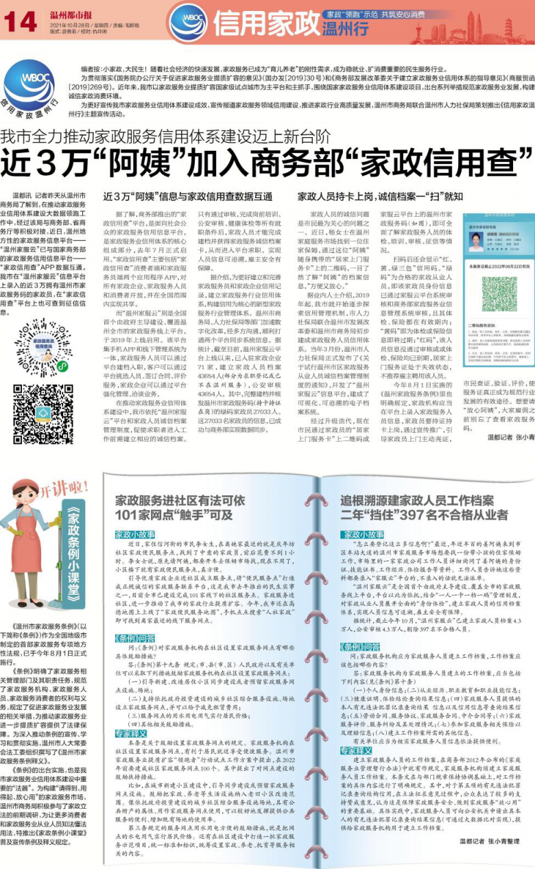 据业内人士介绍,2019年起,我市就开始逐步探索信用管理机制,市人力社保局联合温州市发展改革委和温州市商务局初步建成家政服务人员信用体系。当年3月份,温州市人力社保局正式发布了《关于试行温州市区家政服务从业人员诚信档案管理制度的通知》,开发了“温州家服云”信息平台,建成了可视化、可追溯的电子档案系统。