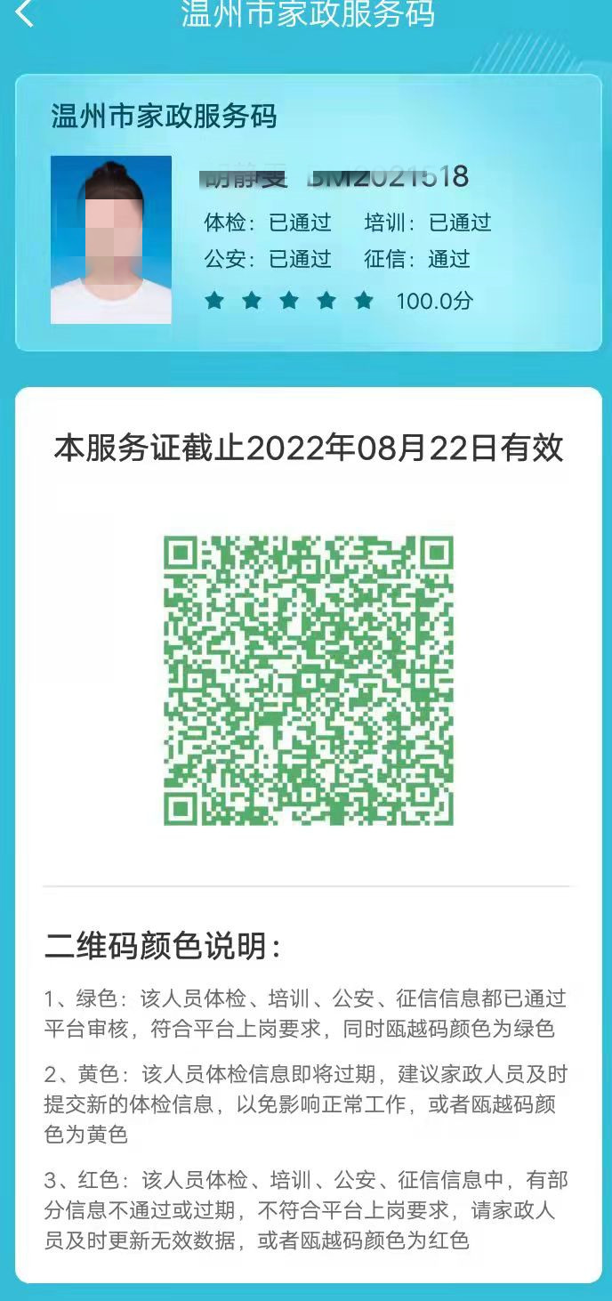 经过升级迭代,现在市民通过家政员的“居家上门服务卡”上二维码或家服云平台上的温州市家政服务码(如图),即可全面了解家政服务人员的体检、培训、审核、征信等情况。
