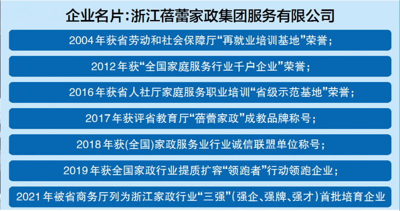 “打造完整的家政系统,完善的培训体系、标准的服务流程是我们一直追求的目标。”2009年,蓓蕾家政公司正式成立。经过20来年的发展,蓓蕾家政从最初只培训几名家政阿姨到培训月嫂、家政阿姨、保育员、医务护工等,业务涵盖生、老、病、养等四大领域,成为温州家政培训市场和医护市场的行业先行者。