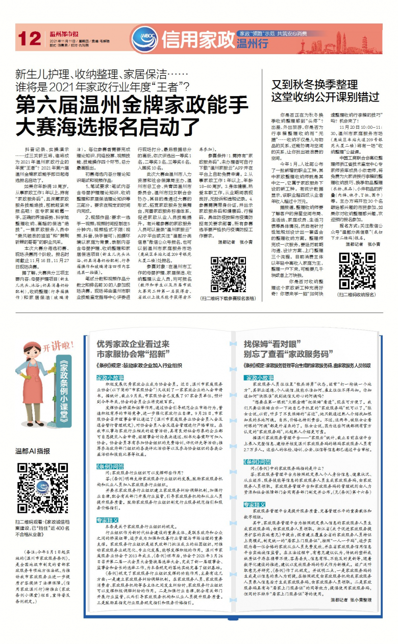 抖音记录、实操演示……过三关斩五将,谁将成为2021年温州家政行业的年度“王者”?2021年第六届温州金牌家政能手即日起海选报名启动了。