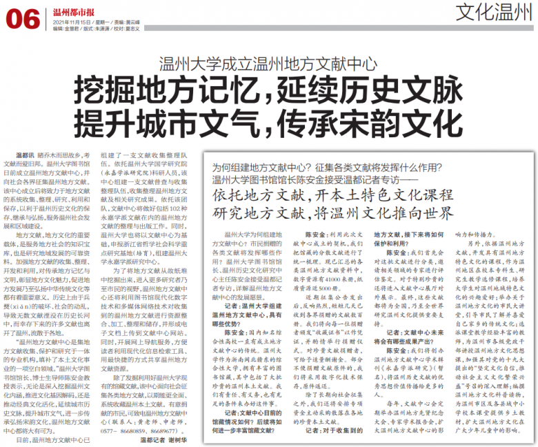 为何组建地方文献中心?征集各类文献将发挥什么作用?温州大学图书馆馆长陈安金接受温都记者专访——